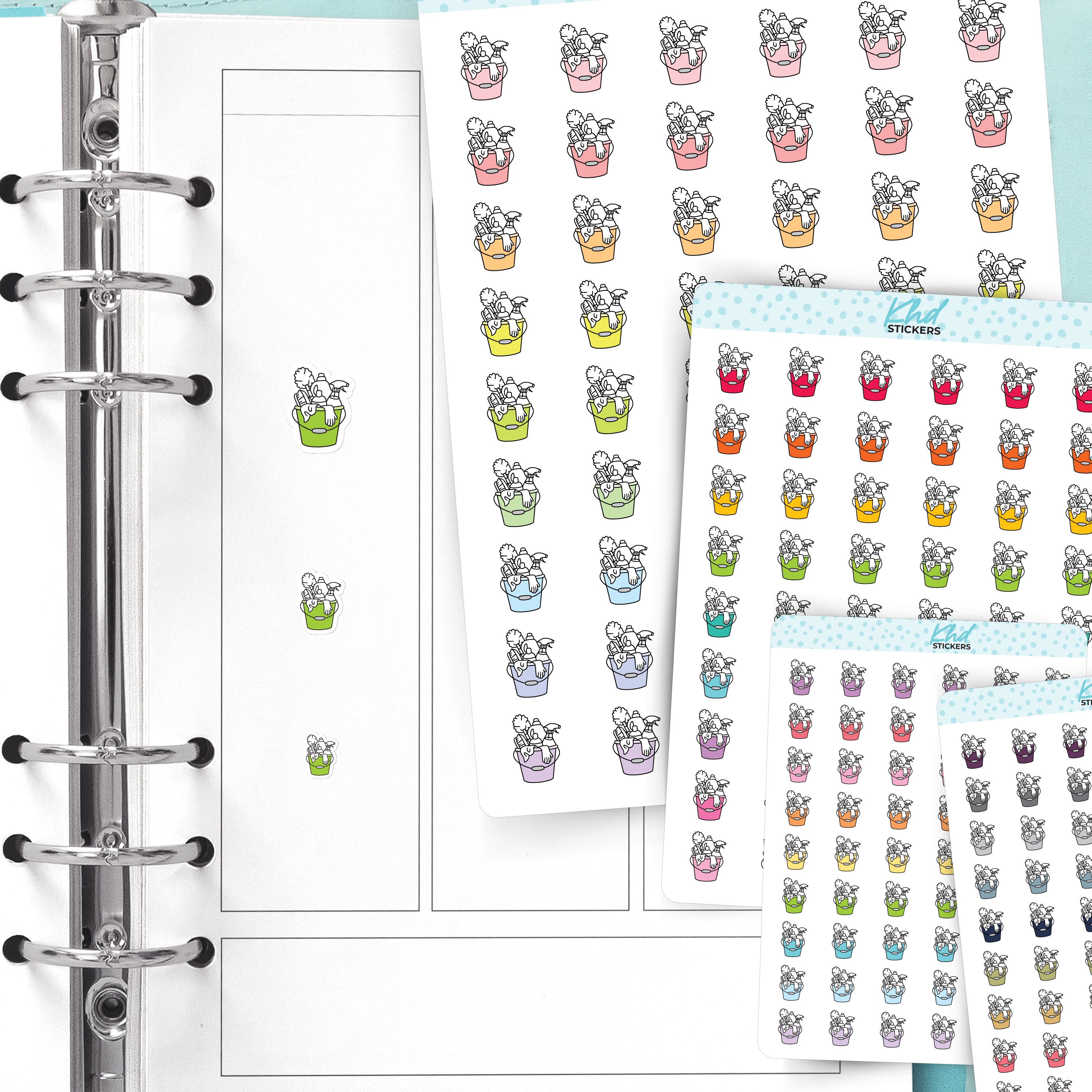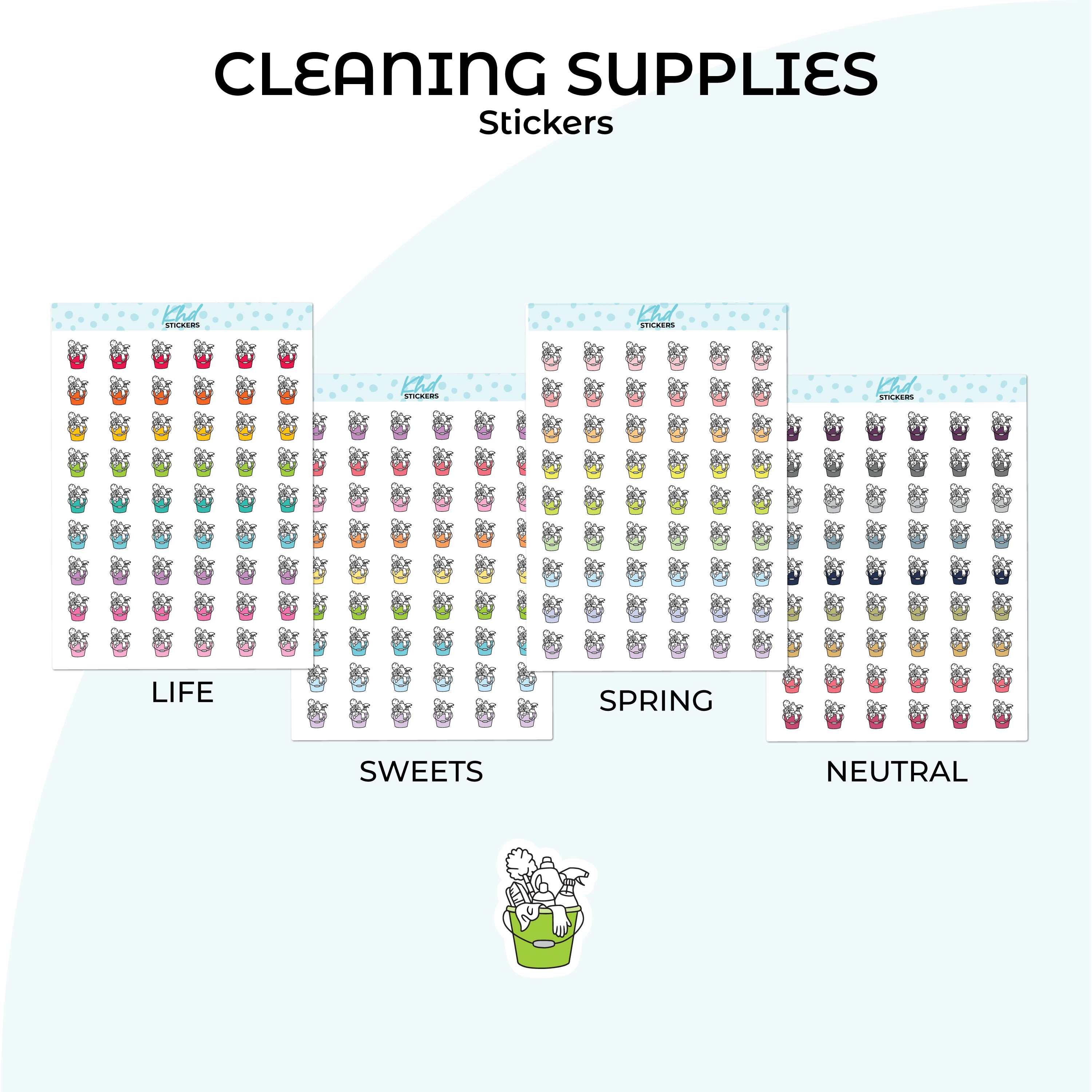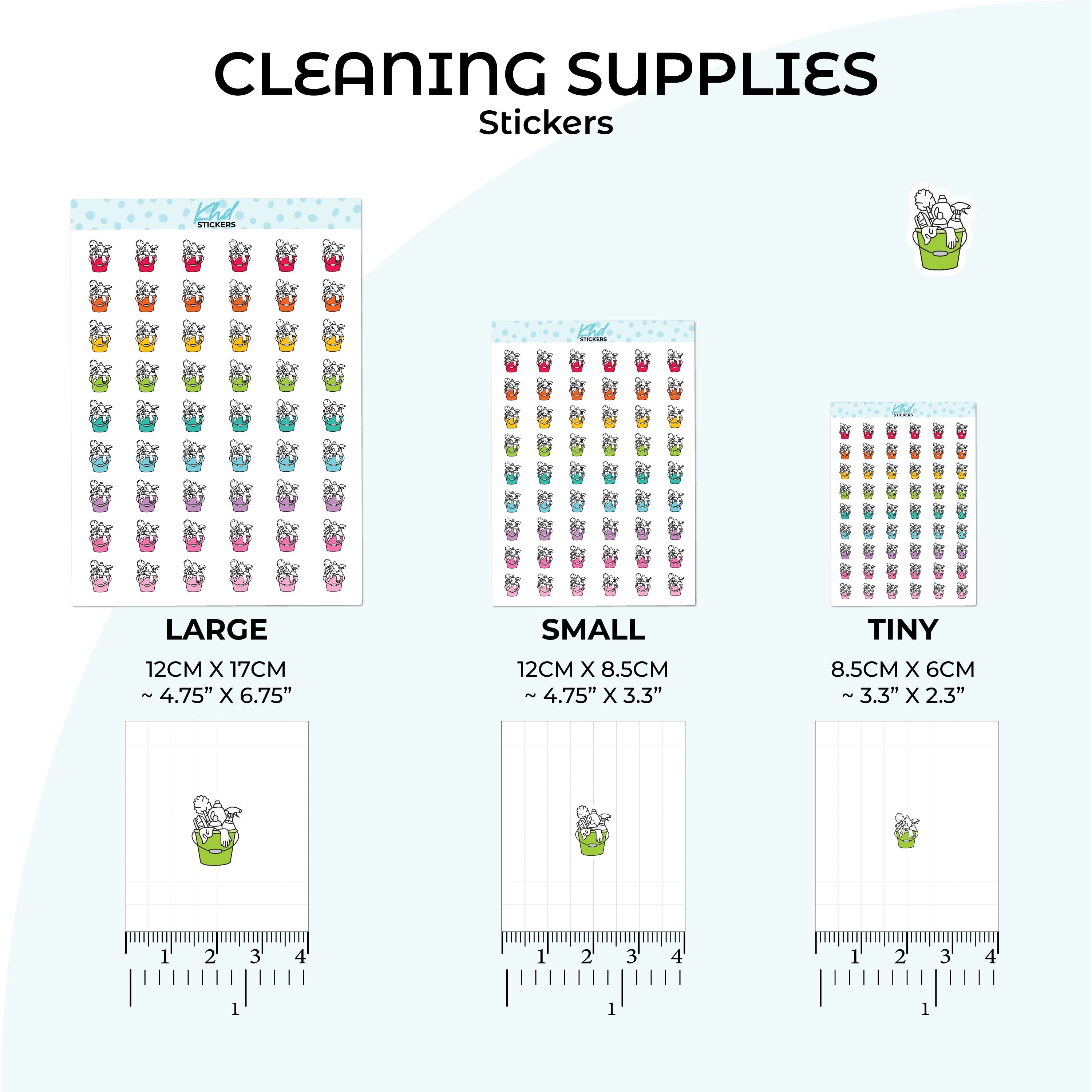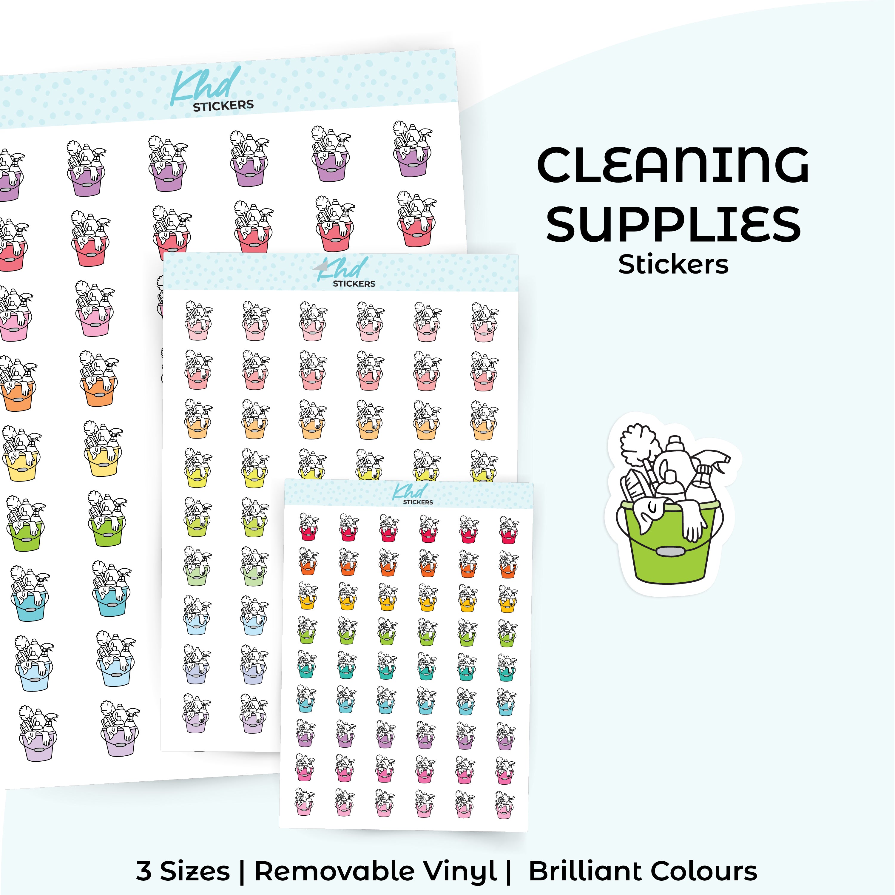 Cleaning Supplies Planner Stickers. Select from one of 4 colourways, or select a sheet of your favourite colour. Available in three great sizes making it easy to match your planning style.