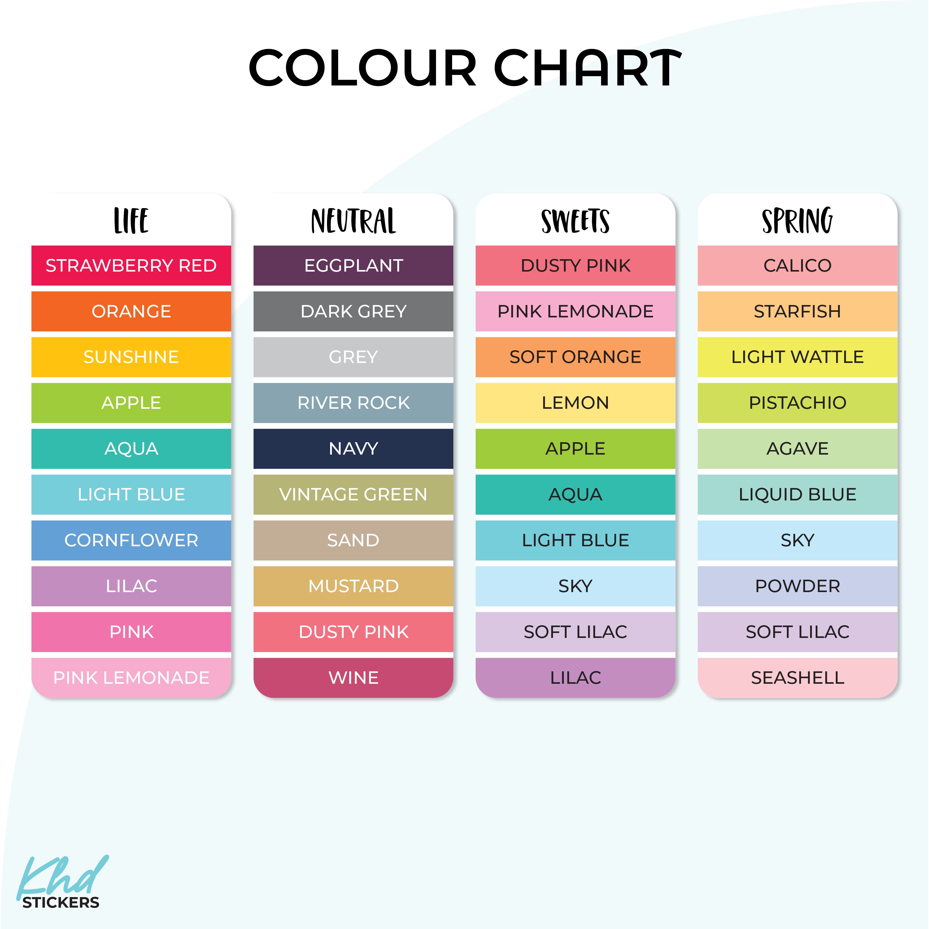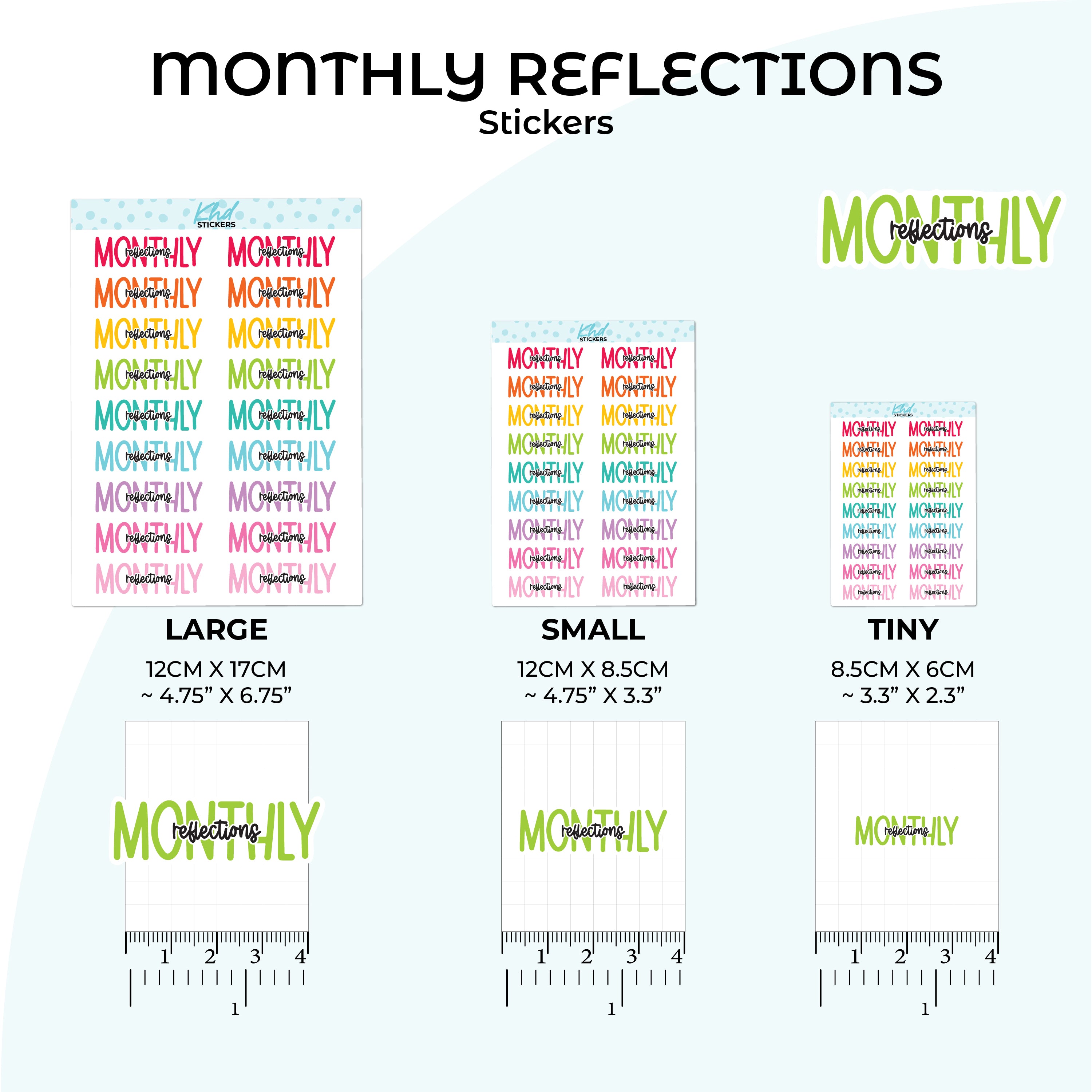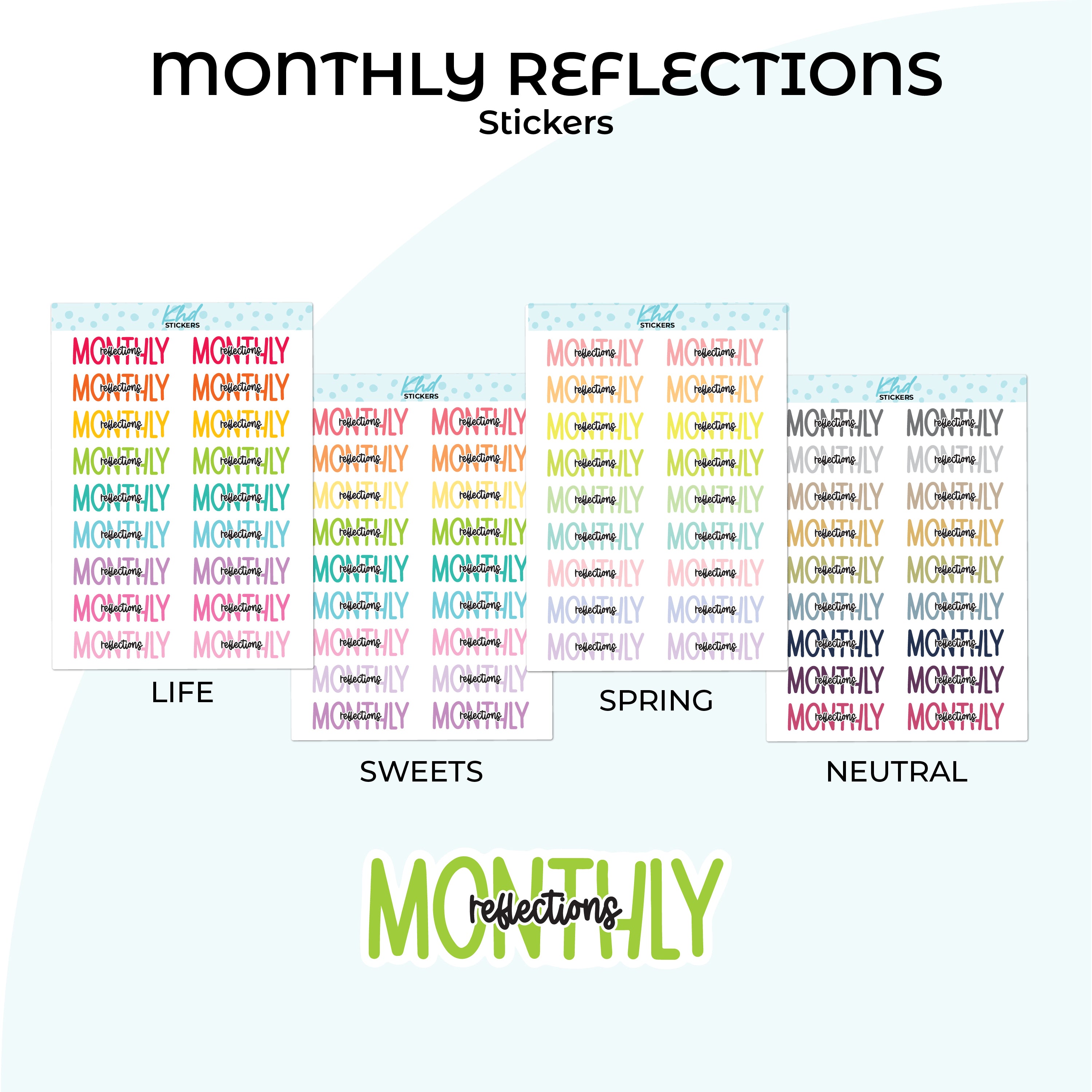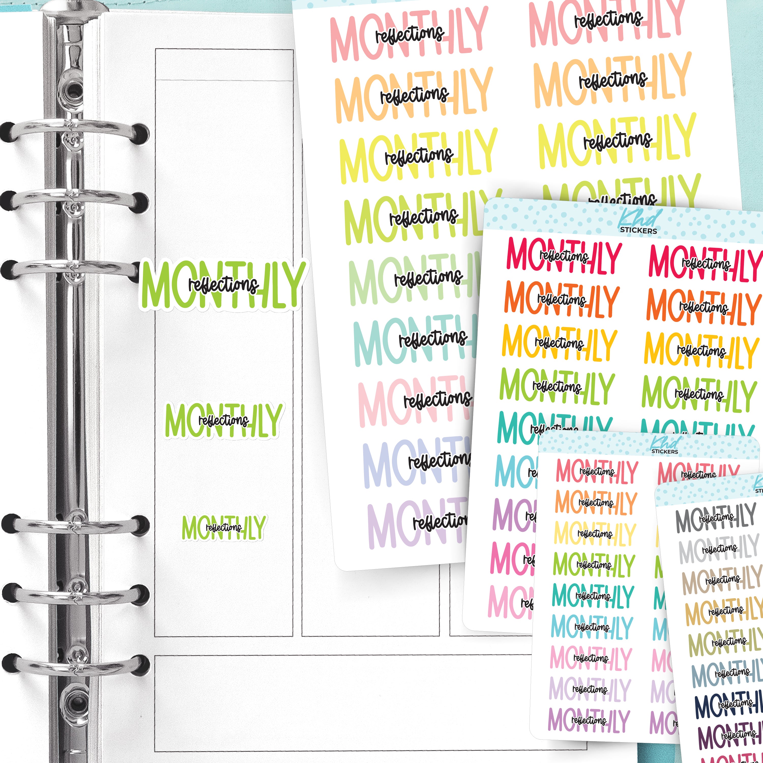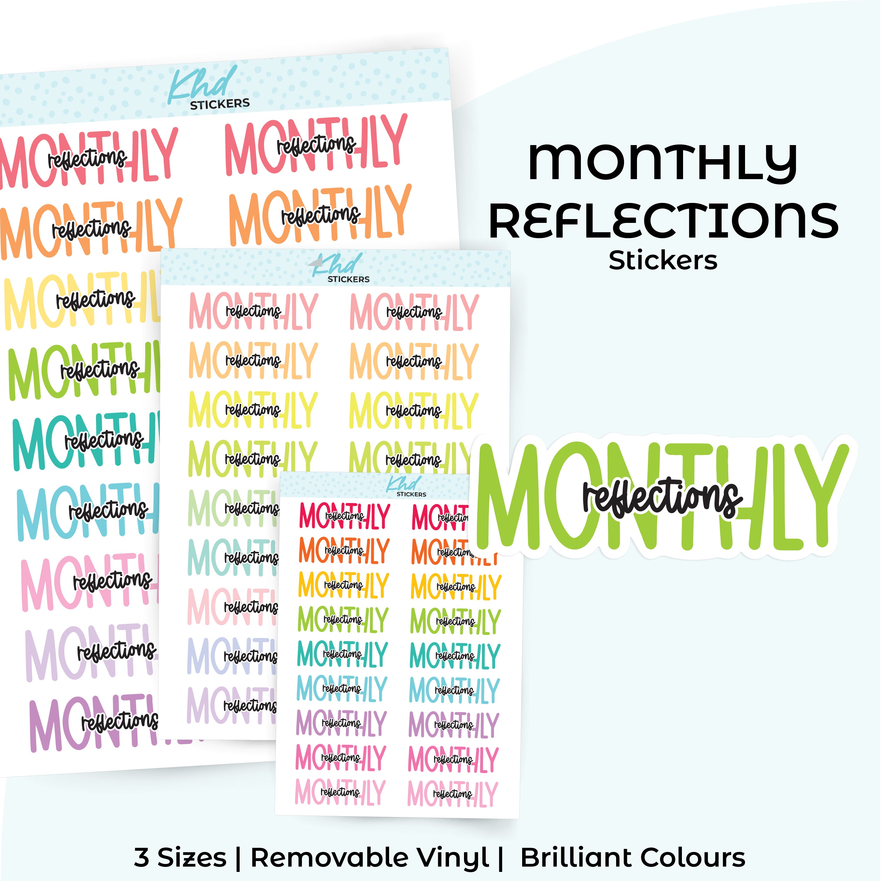 Monthly Reflections Planner Stickers in three sizes and 35 colourways. Removable, smooth-matte finish.