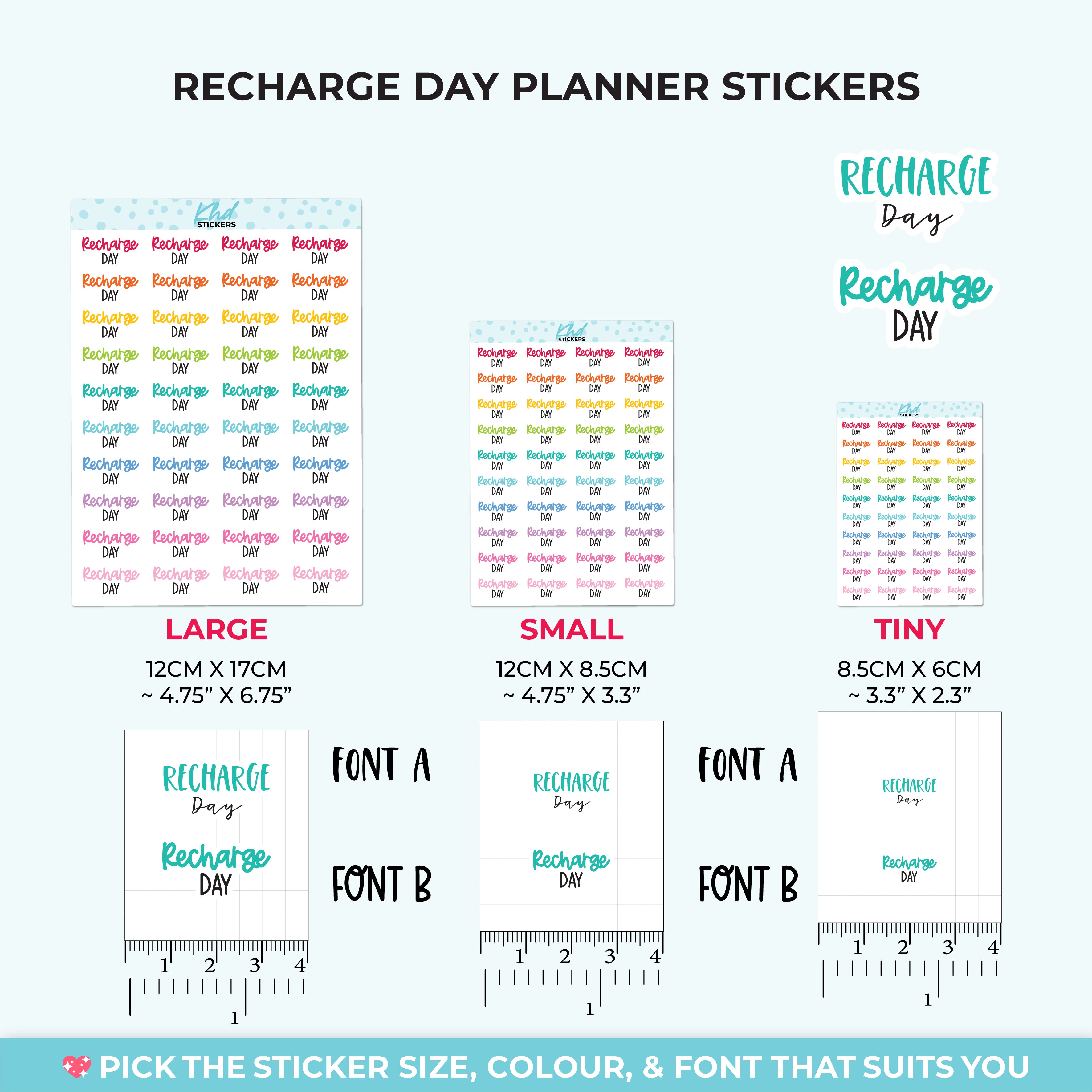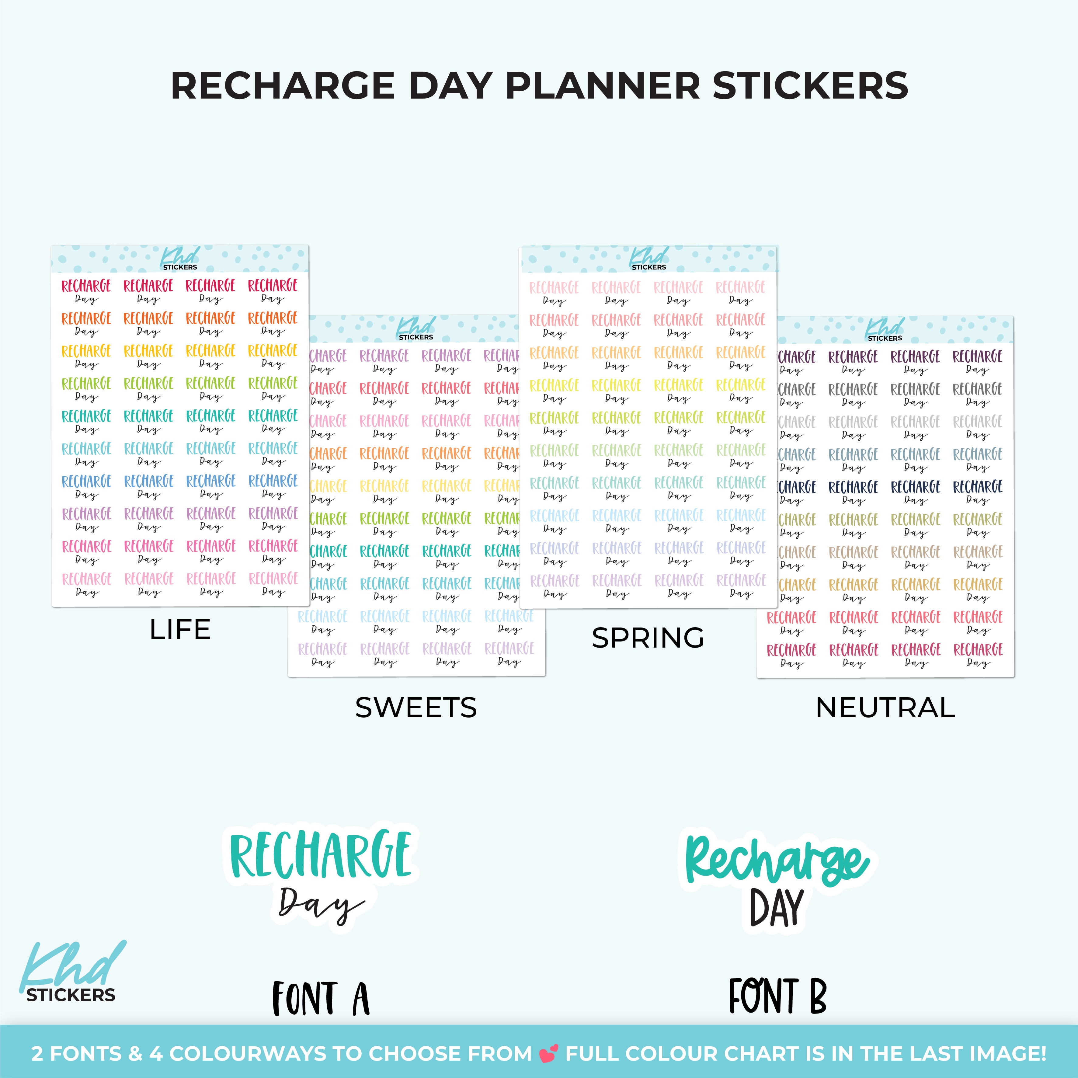 Recharge Day Planner Stickers. Select from one of 4 colourways, or select a sheet of your favourite colour. Available in three great sizes making it easy to match your planning style.